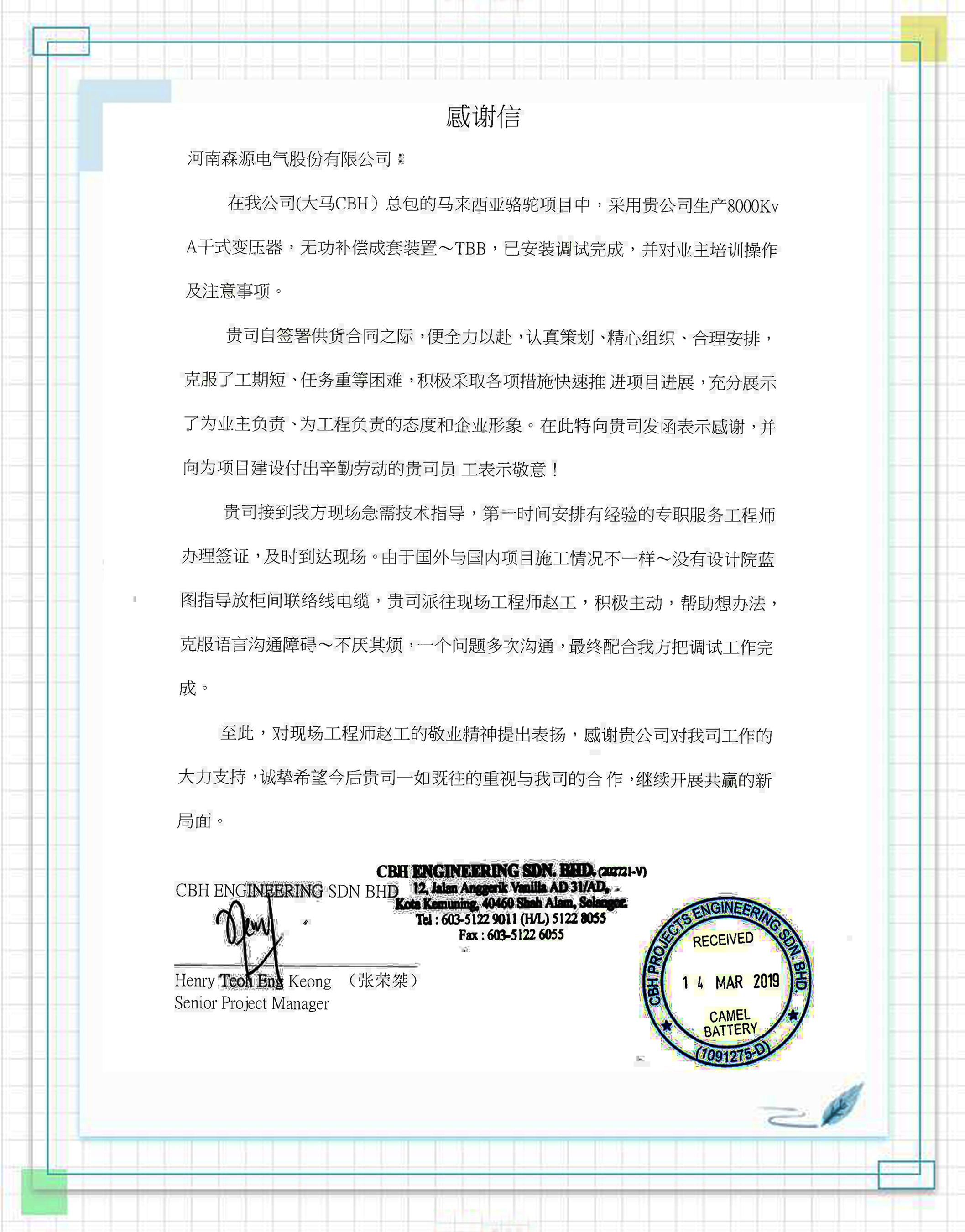 ????? 近日,一封來自馬來西亞大馬CBH公司的感謝信漂洋過海傳到森源電氣,森源提供的卓越產(chǎn)品和一流服務(wù)贏得了他們由衷的贊譽。